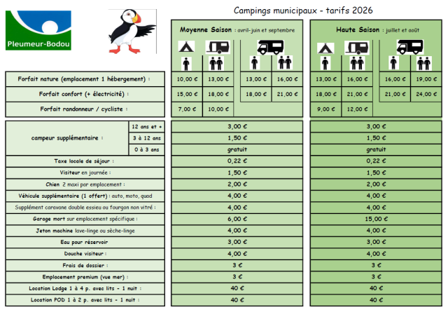 Travailleurs saisonniers à Pleumeur-Bodou : afin de répondre à la problématique de l’hébergement des jeunes et des travailleurs saisonniers, une remise tarifaire est accordée sur demande et sur présentation d’un justificatif (contrat de travail saisonnier à Pleumeur-Bodou).